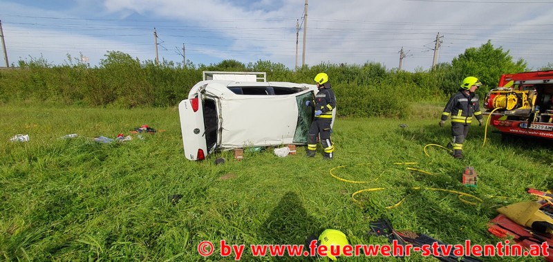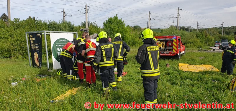 St. Valentin, Bezirk AMSTETTEN. Schwerer Verkehrsunfall in Gutenhofen, Person durch Feuerwehr aus Fahrzeug befreit.