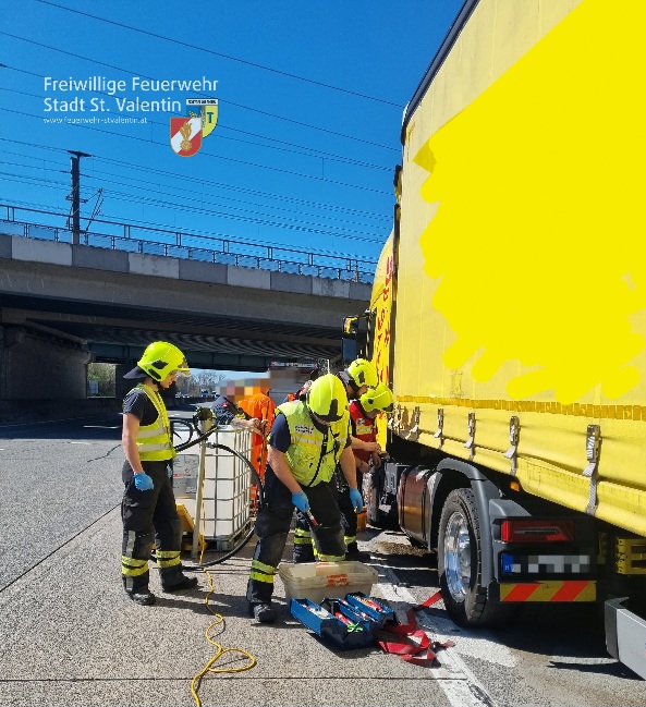 Bei einer Sattelzugmaschine kam es aufgrund einer Beschädigung des Dieseltanks zu einem Austritt von Treibstoff auf der A1 Autobahn.