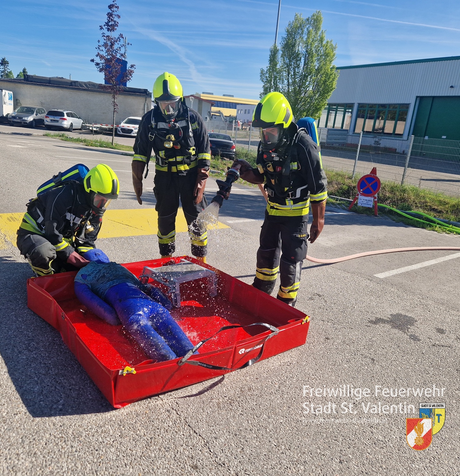 Die ersteintreffende Feuerwehr St.Valentin handelte sofort. Unter Schutzstufe 1 wurde der Verunglückte rasch aus dem Gefahrenbereich gerettet und einer groben Dekontamination unterzogen.