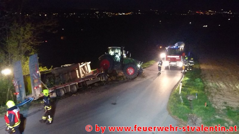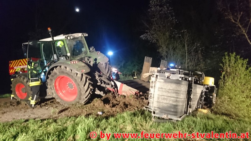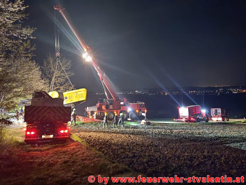 Durch den Einsatzleiter wurde das in Amstetten stationierte Kranfahrzeug des NÖ Landesfeuerwehrverbandes zur Bergung hinzualarmiert. In der Zwischenzeit begann die Exekutive mit der Unfallaufnahme. Bis zum Eintreffen des Sondergerätes konnte mittels Seilwinde des Rüstlöschfahrzeuges der Anhänger samt Traktor gerade gezogen werden. Anschließend fuhr das Gespann selbstständig auf die Straße zurück.