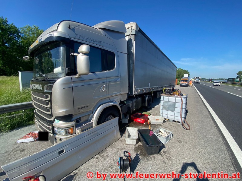Bei einem Richtung Wien fahrenden Sattelzug wurde der Tank beschädigt und er verlor darauf hin auf einer Länge von ca. 1,5km Diesel. Durch die Mannschaft des Tanklöschfahrzeuges wurde der austretende Diesel aufgefangen und der ausgetretene Diesel gemeinsam mit der ASFINAG gebunden. Durch die Autobahnpolizei Amstetten wurde der erste Fahrstreifen abgesichert.