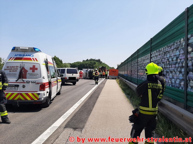 Da beim Unfall keine Person eingeklemmt wurde und nur leichte Verletzungen davon trug, konnte umgehend nach Start des Hubschrauber eine Fahrspur freigegeben werden. Die Feuerwehren begannen sofort mit der Bergung der drei beteiligten Fahrzeuge. Durch die Feuerwehr Haag konnte der verunfallte BMW rasch entfernt werden. Durch das Wechselladefahrzeug St. Valentin wurde der abgerissene Anhänger aus der Leitschiene gezogen und durch die FF Haag verbracht. Die Bergung des auf der Seite liegenden Kleintransporter gestaltete sich etwas schwieriger. Da das Fahrzeug komplett beladen, der Aufbau auf zwei Ecken aufgerissen und durch die Ladung ein dementsprechendes Gesamtgewicht zusammenkam, wurde gemeinsam mit der Seilwinde des Rüstlöschfahrzeuges und dem Ladekran unseres WLF das Fahrzeug aufgestellt. Der Kleintransporter wurde das HLF3 Haag von der Autobahn geschleppt. Obwohl zwei Fahrstreifen während des Einsatzes gesperrt waren, kam es im Sonntagsverkehr nur zu einem kurzen Rückstau.