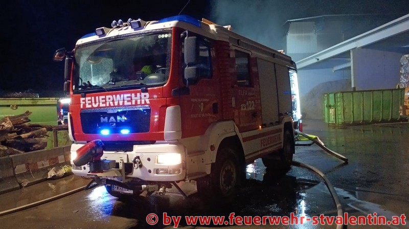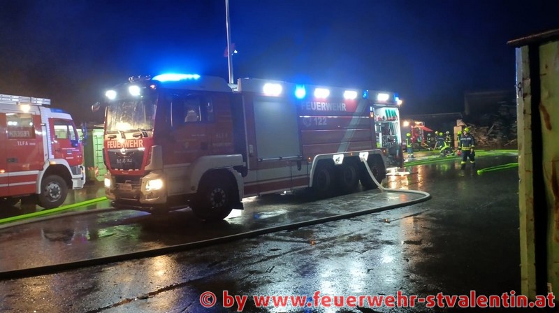 Die Feuerwehr St. Valentin war mit dem Großtanklöschfahrzeug, Tanklöschfahrzeug, Rüstlöschfahrzeug, Versorgungsfahrzeug und der Teleskopbühne am Einsatzort. Mittels Bagger und Greifer wurde das Brandgut, wobei es sich um gewerblichen Abfall handelte, auf Container verladen und an einer anderen Stelle mit einem Radlader zerteilt und abgelöscht.