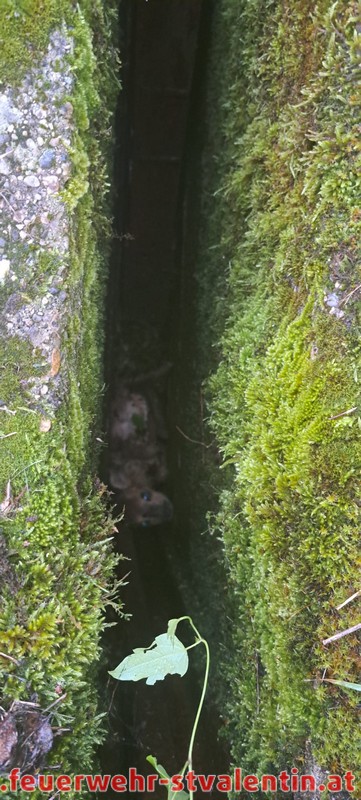 Aufmerksame Anwohner hörten die schreie eines Tieres. Bei der Nachschau entdeckten sie ein Rehkitz das in einen Handbreiten Spalt der Steuerung für eine Wehranlage fiel und darin feststeckte. Um das Tier aus seiner misslichen Lage zu befreien und nicht zu berühren wurde mit Besenstielen und Leinen probiert das Tier zu erwischen was auch gelang. Mit Grasbüscheln wurde es im angrenzenden Feld ausgesetzt und suchte sofort das Weite.