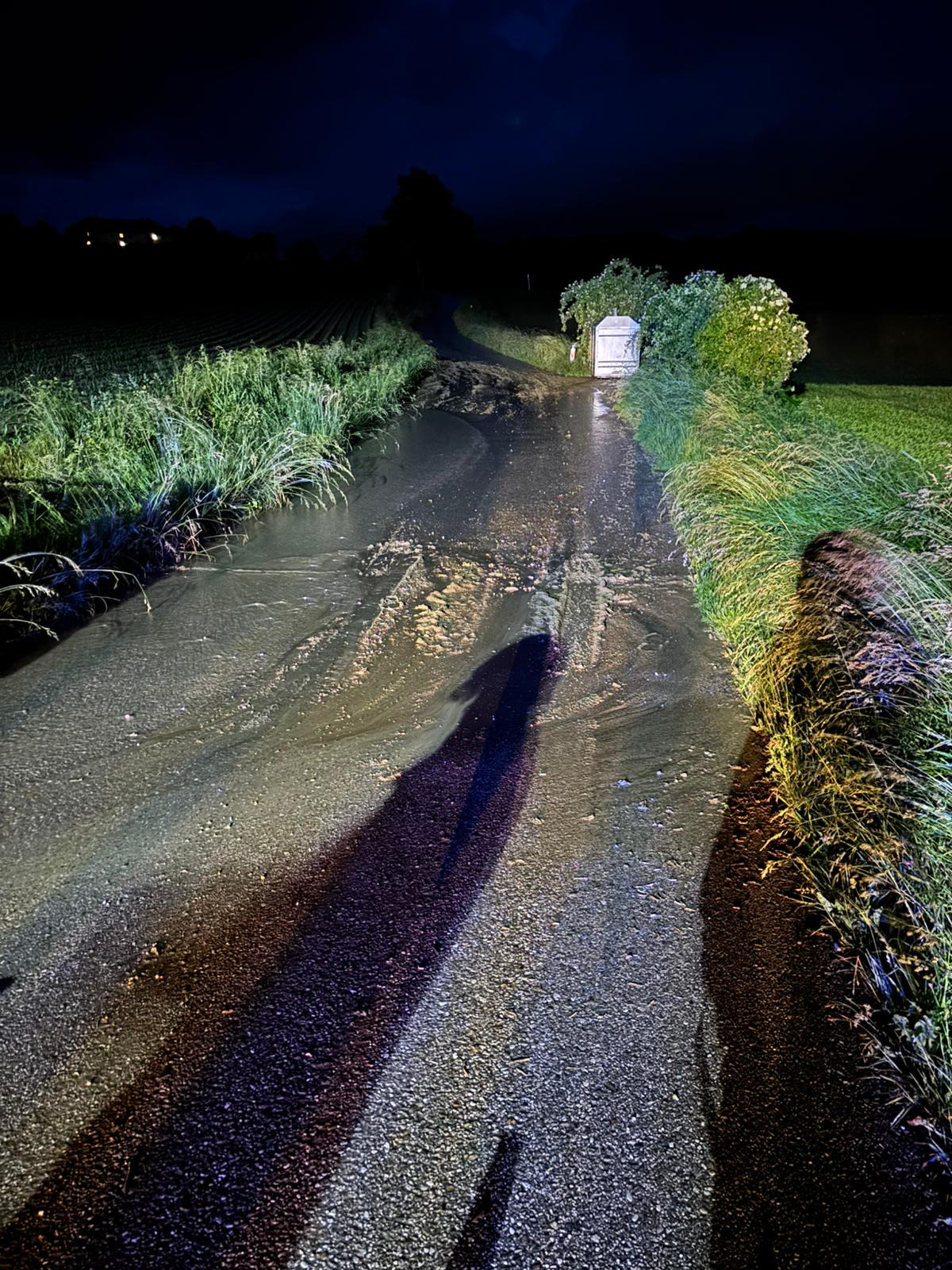 In der Raiffeisenstraße konnte der Kanal das Regenwasser nicht mehr aufnehmen und überflutete die Straße.