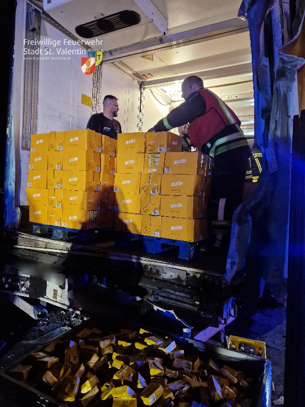 Anschliessend musste der Sattelauflieger gesichert und vollständig entladen werden. Die gesamte Ladung war verrutscht. Die FF Amstetten übernahm die Bergung der des Fahrzeuges.
