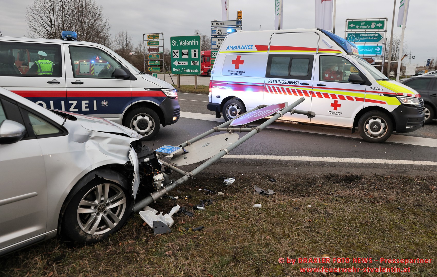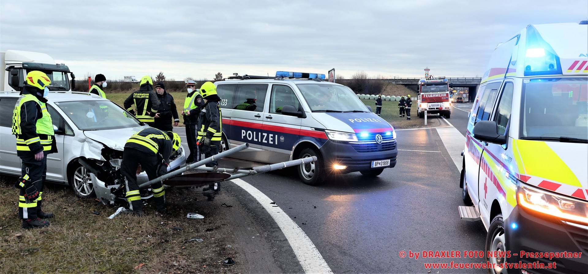 Die Feuerwehren Stadt St. Valentin, Stadt Haag und Rems wurden zu einer Menschenrettung nach Verkehrsunfall auf der Abfahrtsrampe St. Valentin alarmiert. Laut ersten Informationen war eine Person im Fahrzeug eingeklemmt. Bei Eintreffen der ersten Feuerwehreinheiten konnte jedoch Entwarnung gegeben werden: keine der beiden Insaßen war im PKW eingeklemmt. Die Beifahrerin verletzte sich bei dem Unfall unbestimmten Grades und wurde vom Roten Kreuz St. Valentin versorgt und schließlich in ein Krankenhaus verbracht.