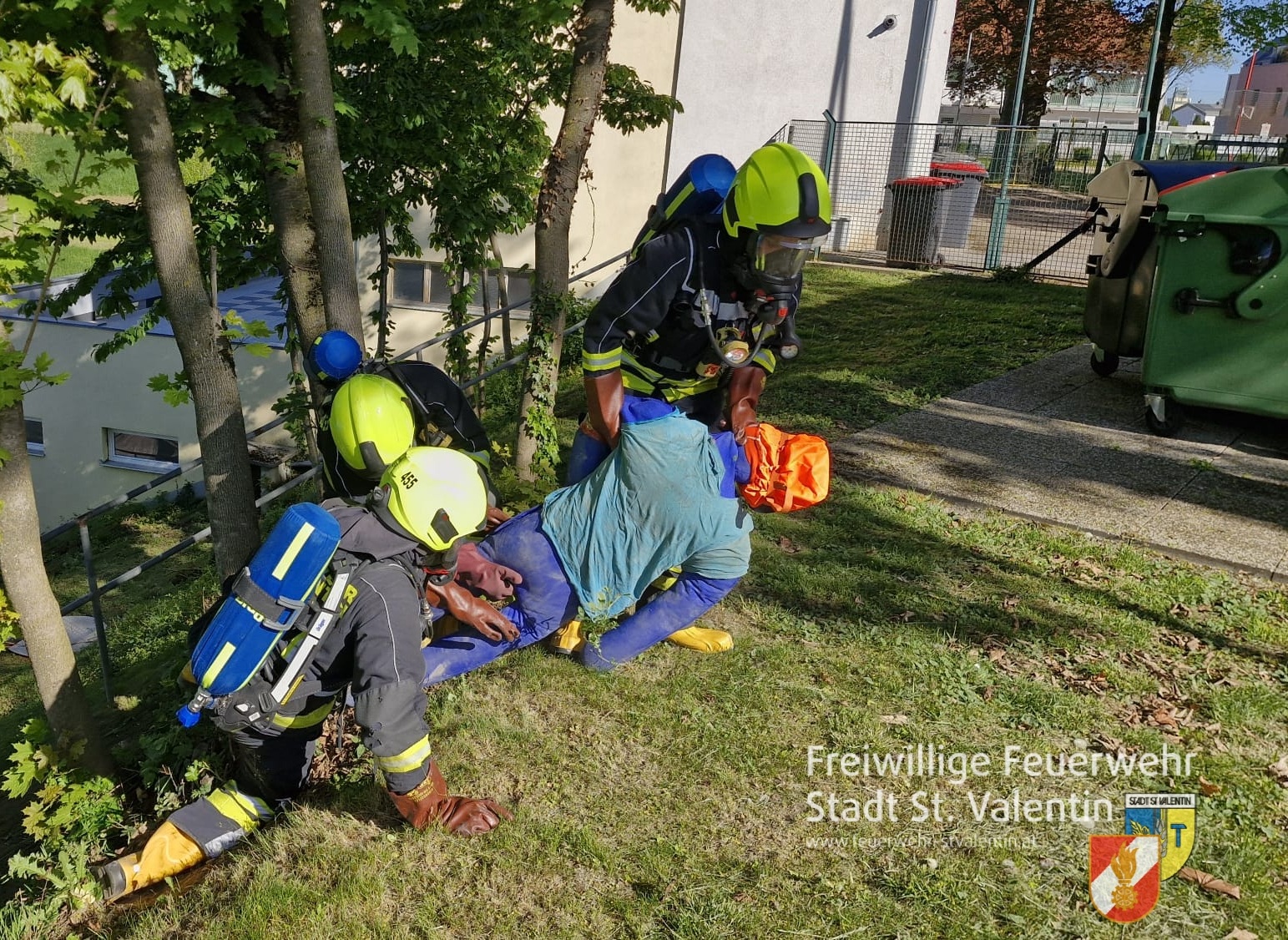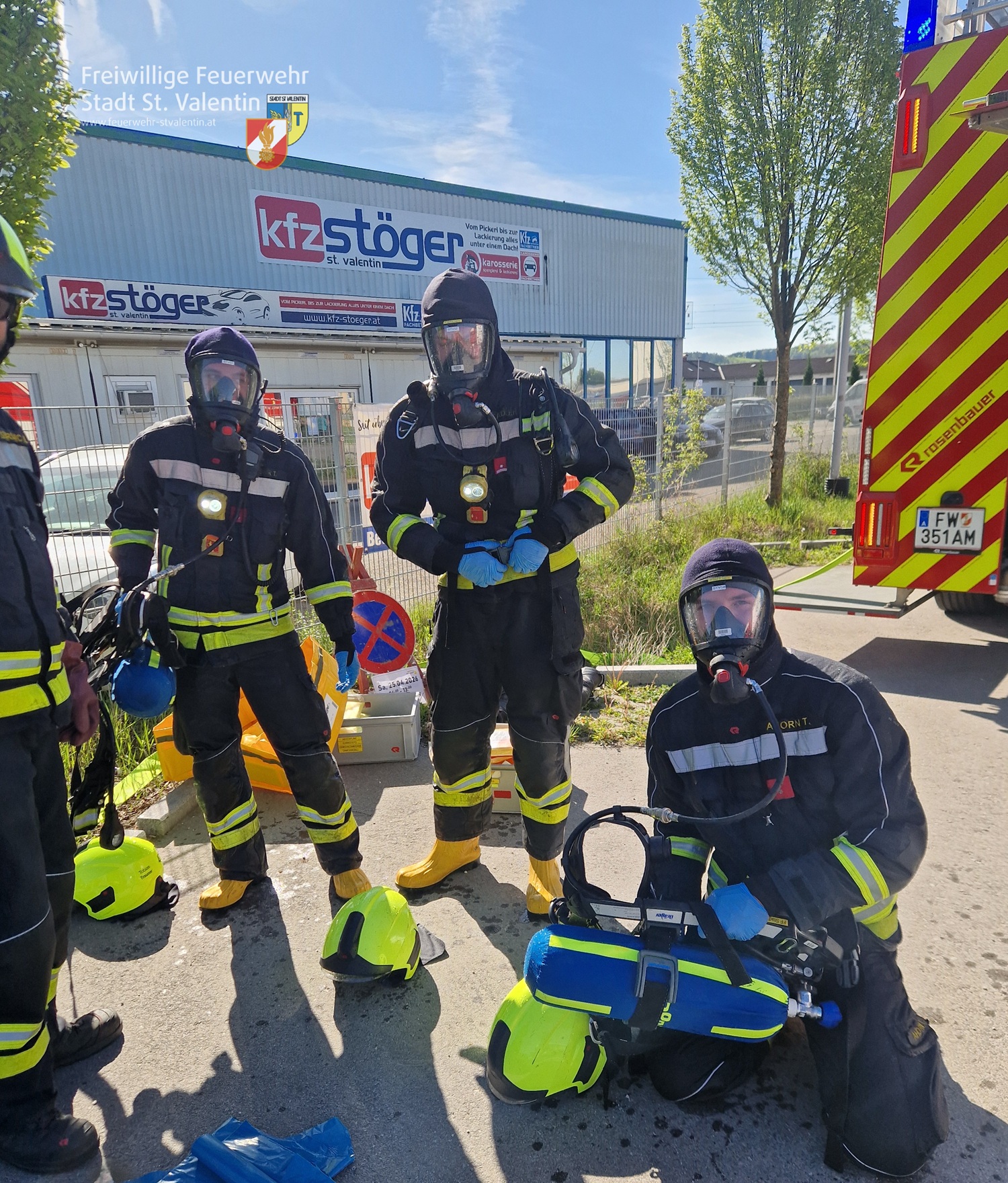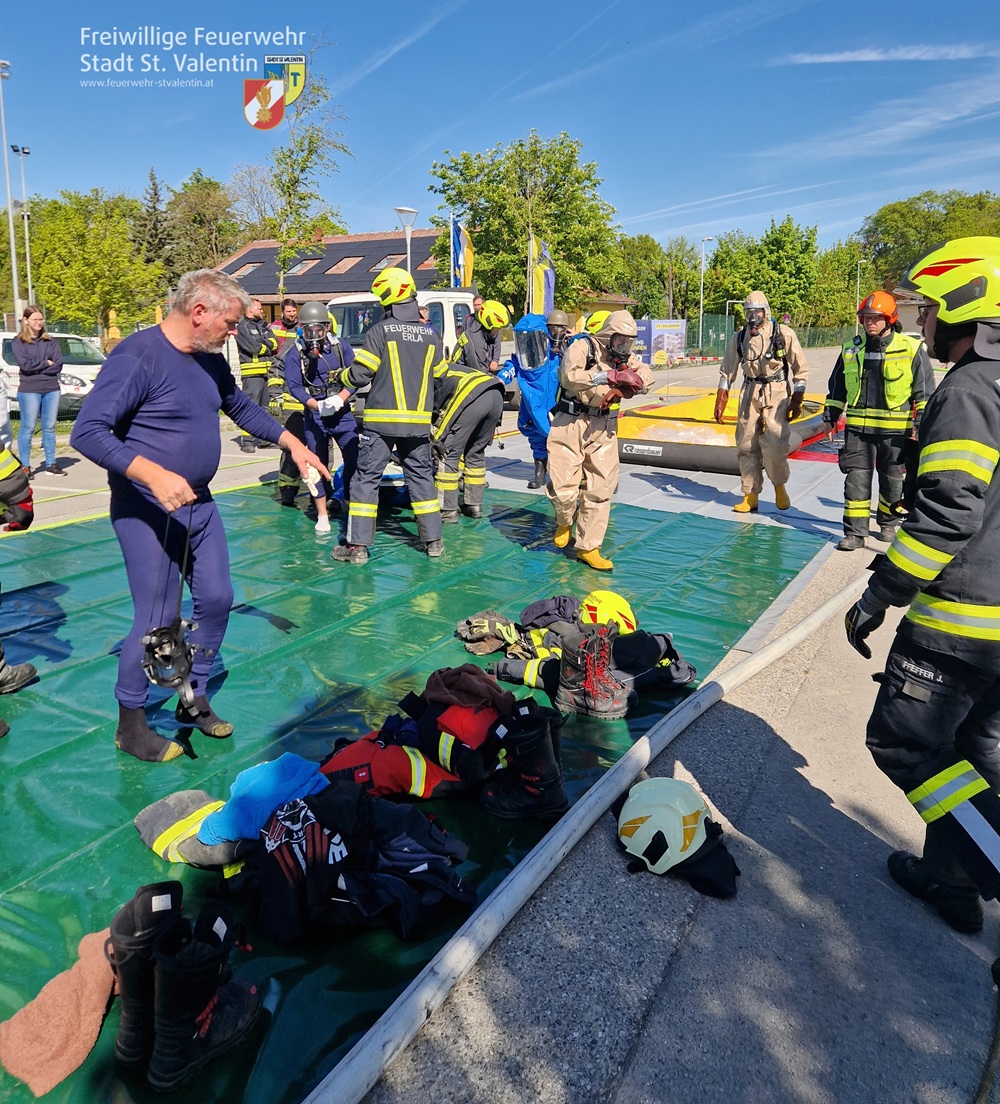 Die ersteintreffende Feuerwehr St.Valentin handelte sofort. Unter Schutzstufe 1 wurde der Verunglückte rasch aus dem Gefahrenbereich gerettet und einer groben Dekontamination unterzogen.
