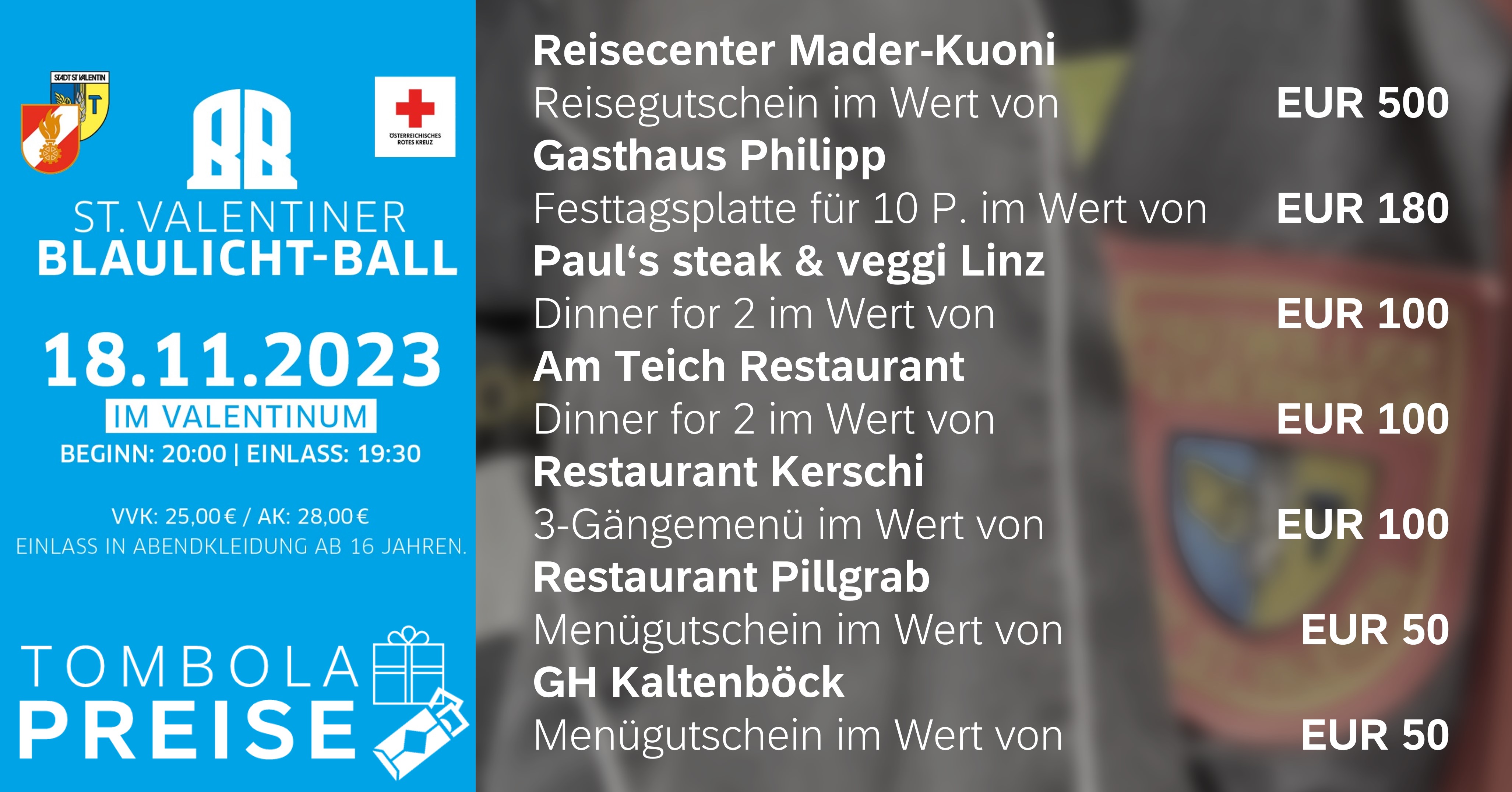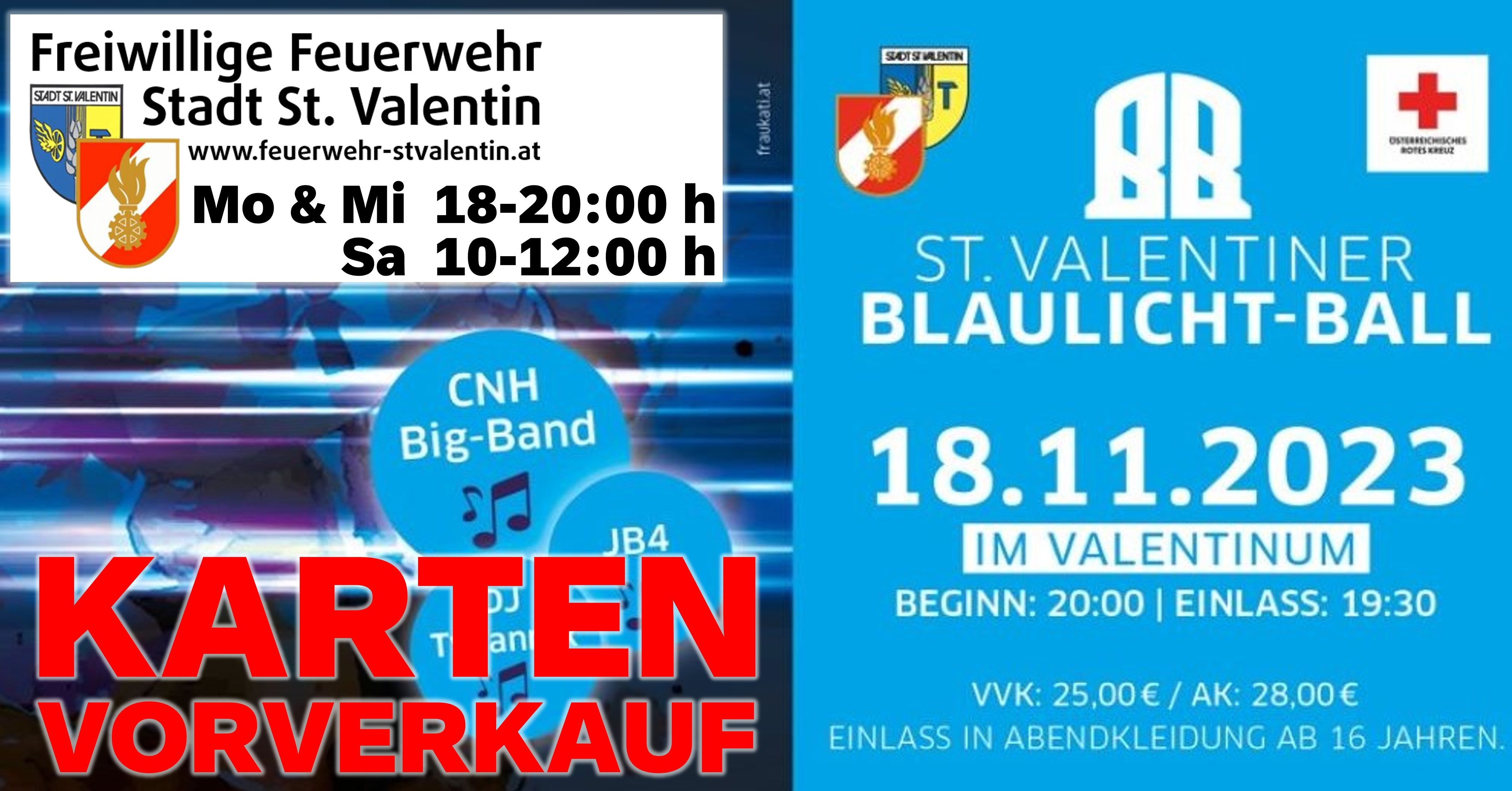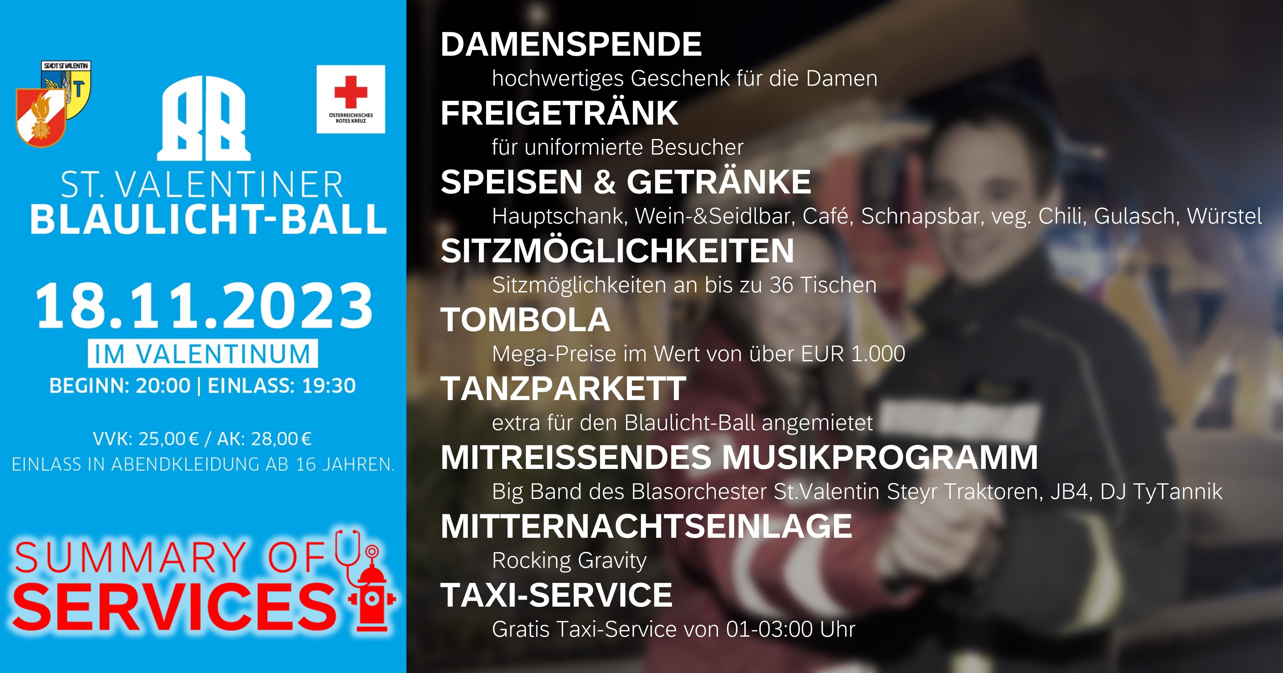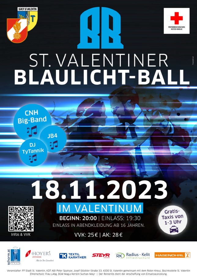Es ist uns eine Ehre, gemeinsam mit dem Roten Kreuz St. Valentin den 1. St. Valentiner BLAULICHTBALL organisieren zu dürfen! |